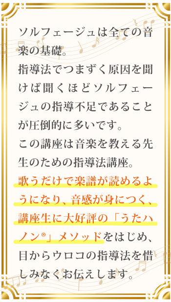 多くのソルフェージュの知識だけでなく、それを子どもたちにわかりやすく伝える方法まで教えてくださる貴重な講座だと思います。
