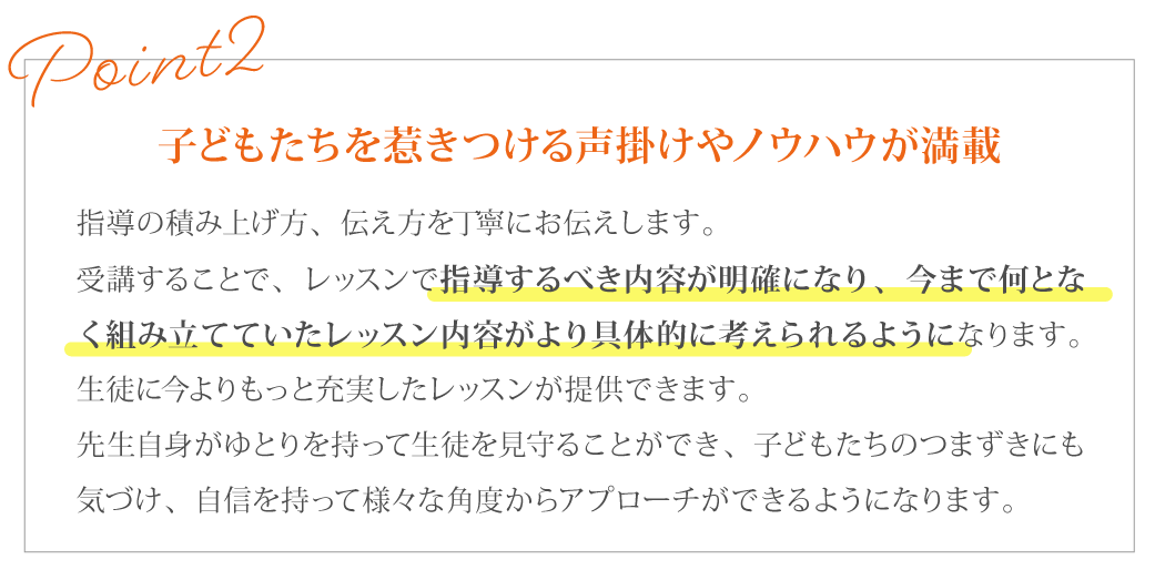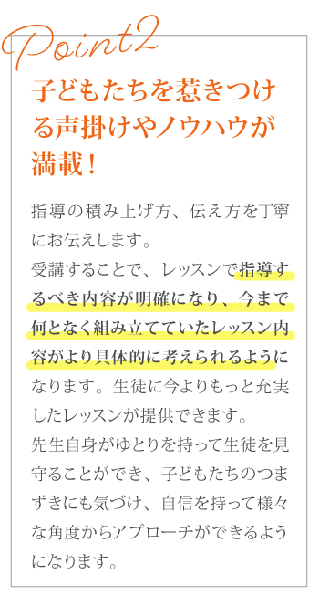 受講後は、やるべき事が明確になったので、より具体的にレッスン内容を考えられるようになり、確実に以前よりもレッスンが充実しています。
