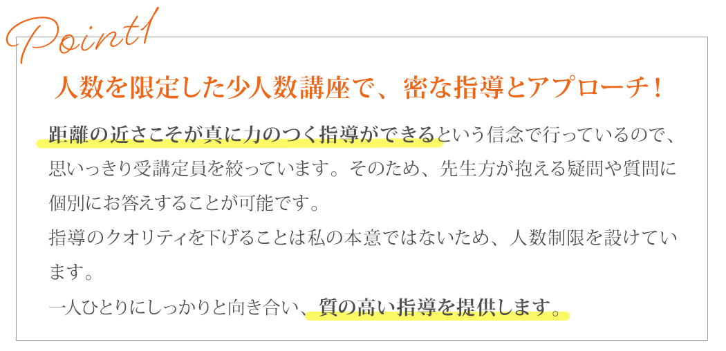 先生の講座は、指導方法だけでなく、何を目指す為の指導なのか、またどのように段階を踏んで教えるのかを、丁寧に教えて下さいます。