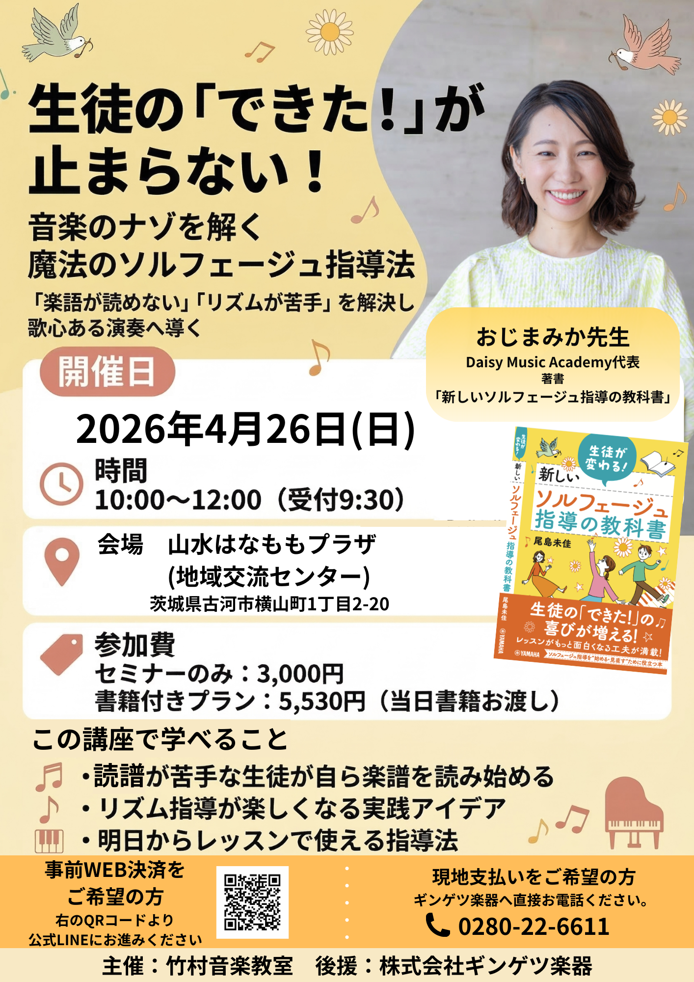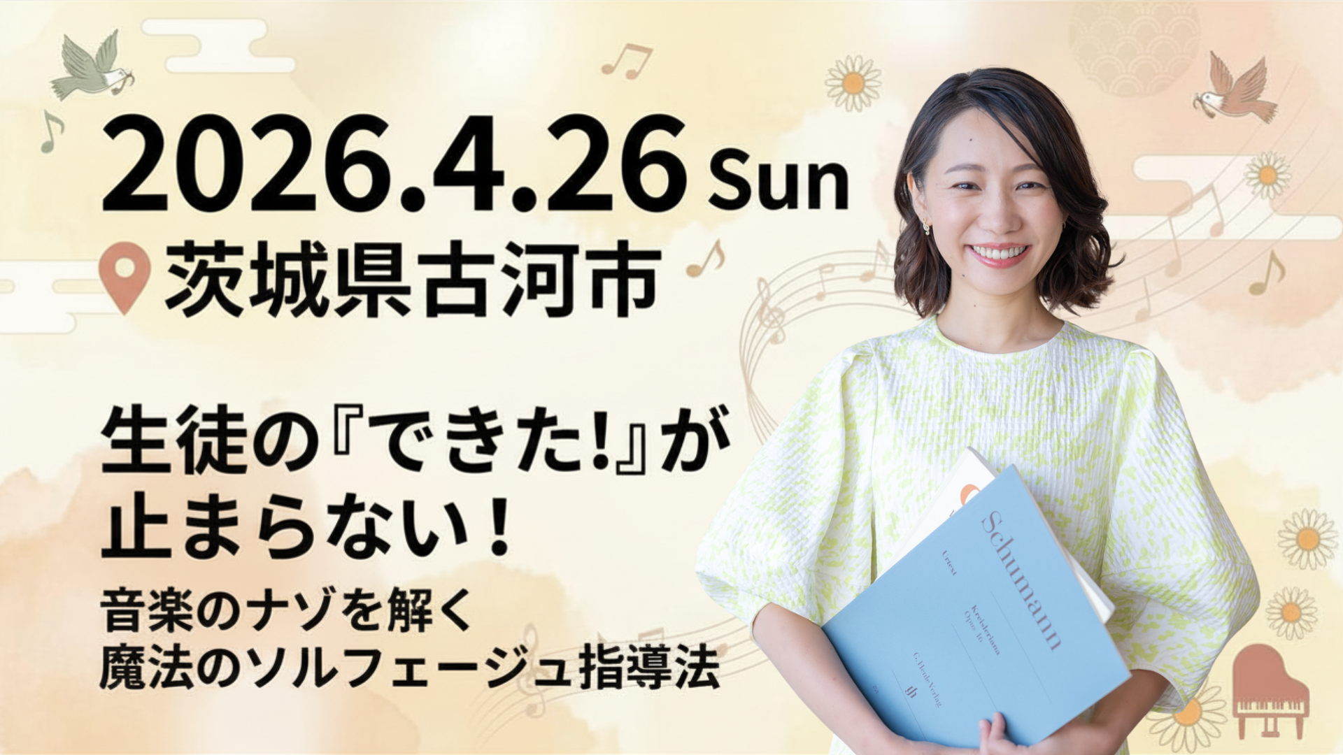 2026年4月26日(日)、茨城県古河市の山水はなももプラザ(地域交流センター)にて、ソルフェージュ指導法セミナーを担当させていただきます。